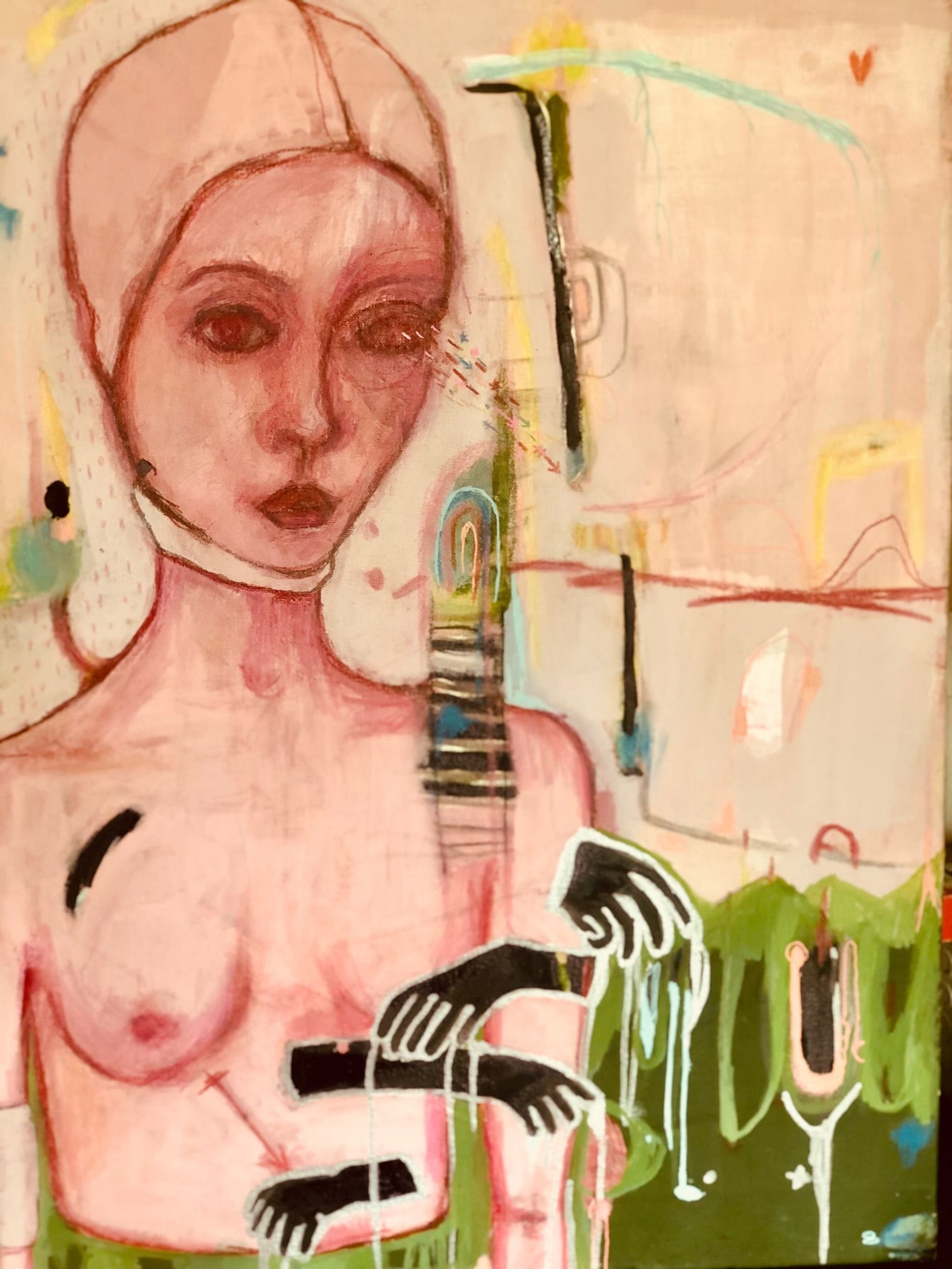 M. Paige Schrock is an Arkansas mixed-media artist and educator. She works in cut-paper collage, acrylic, words, watercolor, colored pencil and scratches. Her work is colorful, bold, and whimsical with an undercurrent of the primordial and sinister. The theme of powerfully-othered female archetypes runs through her work as well as an iconography of personal symbols. Paige is influenced by literature, mythology, esotericism, Jungian psychology, biophilia, and techno-terror.